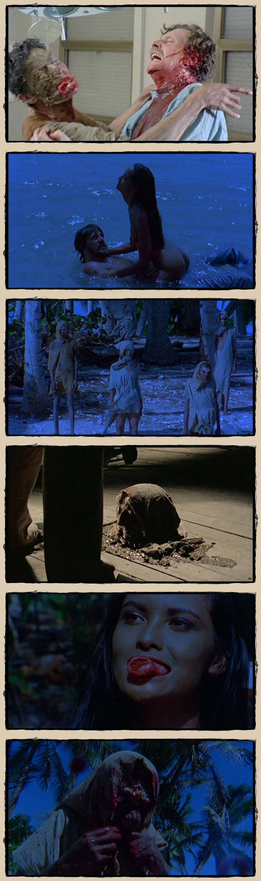 Konuya geldiğimizde, Karayiplerdeki terkedilmiş bir adada zenginler için ilgi çekici bir mekan yaratmayı planlayan girişimci ruhlu biriyle karşılaşıyoruz. Etrafındaki tanıdıklarından gelen bütün uyarılara rağmen “Cat Island” adını vereceği bu mekanı yaratmak konusunda ısrarlı olan girişimcimiz bu amaçla genelde tshirtsüz olarak görülen (ama daha önce de belirttiğim gibi asla tam olarak çıplak kalmayan) Larry’i (George Eastman) görevlendiriyor. Adaya geldiklerinde aslında buranın o kadar da “terkedilmiş” olmadığını ve Laura Gemser ile büyükbabasının adayı çoktan istila etmiş olduklarını görürler. Aynı zamanda onların bir tür değişim içindeki canlıların (kısaca zombiler diyelim) sona kalan örnekleri olduğunu da zamanla anlarlar. Ziyaretçilere karşı da tahmin edileceği gibi pek sıcakkanlı değiller. Ama tabi ki ziyaretçiler de geri adım atmak niyetinde değildir ve bu durumla mücadele etmeye karar verirler. Ta ki adada yaşayan ve öldü sanılan diğer insanlar zombi olarak adaya geri dönene kadar..