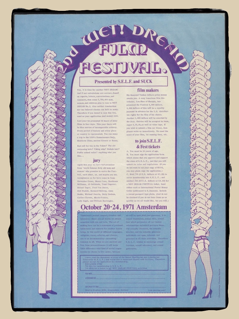 Amsterdam Film Müzesinin yardımıyla Haynes bu etkinliği organize etti ve dünyanın her yerinden insanların katılımı bu çabalarının meyvesini vermesini sağladı. Göz kamaştırıcı Jean Shrimpton Londra’dan gelirken AI Goldstein de Germaine Greer, Richard Neville ve Michael Zwerin gibi isimlerin yanında jüride yer almak için New York’tan geldi. Etkinlik neredeyse her ülkeden misafiri ağırladı ve gösterimlerin kısa sürede tükenmesi ile büyük bir başarı elde edildi. Jüri birincilik ödülünü Ole Ege ve Shinkichi Tajiri tarafından hazırlanan Bodil, a Summer Day in 1910’e verdi ve Donald Cammell’in Performansından Mick Jagger’ın yatakta çekilmiş görüntüleri gibi dikkat çekici anlar yaşandı. Jean Genet Un chant d’amour için Blast ödülünü alırken Christie Eriksson Snow White and the Seven Dwarfs  ile Walt Disney anma ödülünü aldı. Amerikan sexploitation türünün önde gelen isimlerinden Lou Sher de oradaydı ve festivalin uzun metrajlı filmler kategorisi Adultery for Fun and Profit altında ticari dağıtım için ödül alırken festival hakkında Naughty adlı bir belgesel çekildi ve İngiltere’de piyasaya sürüldü.