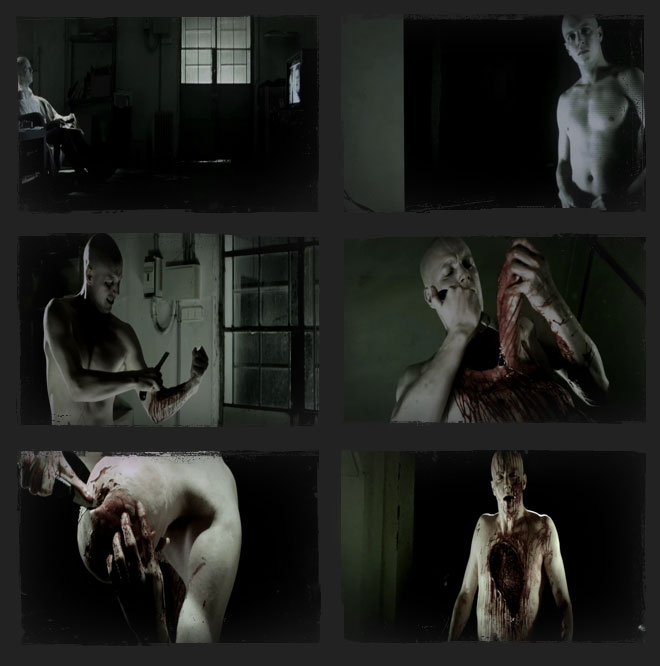 Filmimiz köhne bir odada saçları ve kaşları olmayan bu sebeple yüzündeki hiçbir ifadeyi yakalayamadığımız bir adamın evinde geçmekte. Televizyonun karşısında elinde kumandayla, ne izlediğini bilmeden ve sürekli kanallar arasında gezinen adam boş gözlerle ekrandaki şiddet görüntülülerini hipnotize olmuşçasına izler. Bir süre sonra televizyonu kapatır ve bir el kamerasını ekrana bağlayarak kendi görüntüsünü televizyona yansıtır. Bu sefer Tv’de kendisi vardır, ve şiddet kendisine yönelmiştir. Elindeki maket bıçağıyla vücudunu doğramaya başlar ve yüzündeki o ifadesiz bakışlarla ekrandaki kendisini izler.